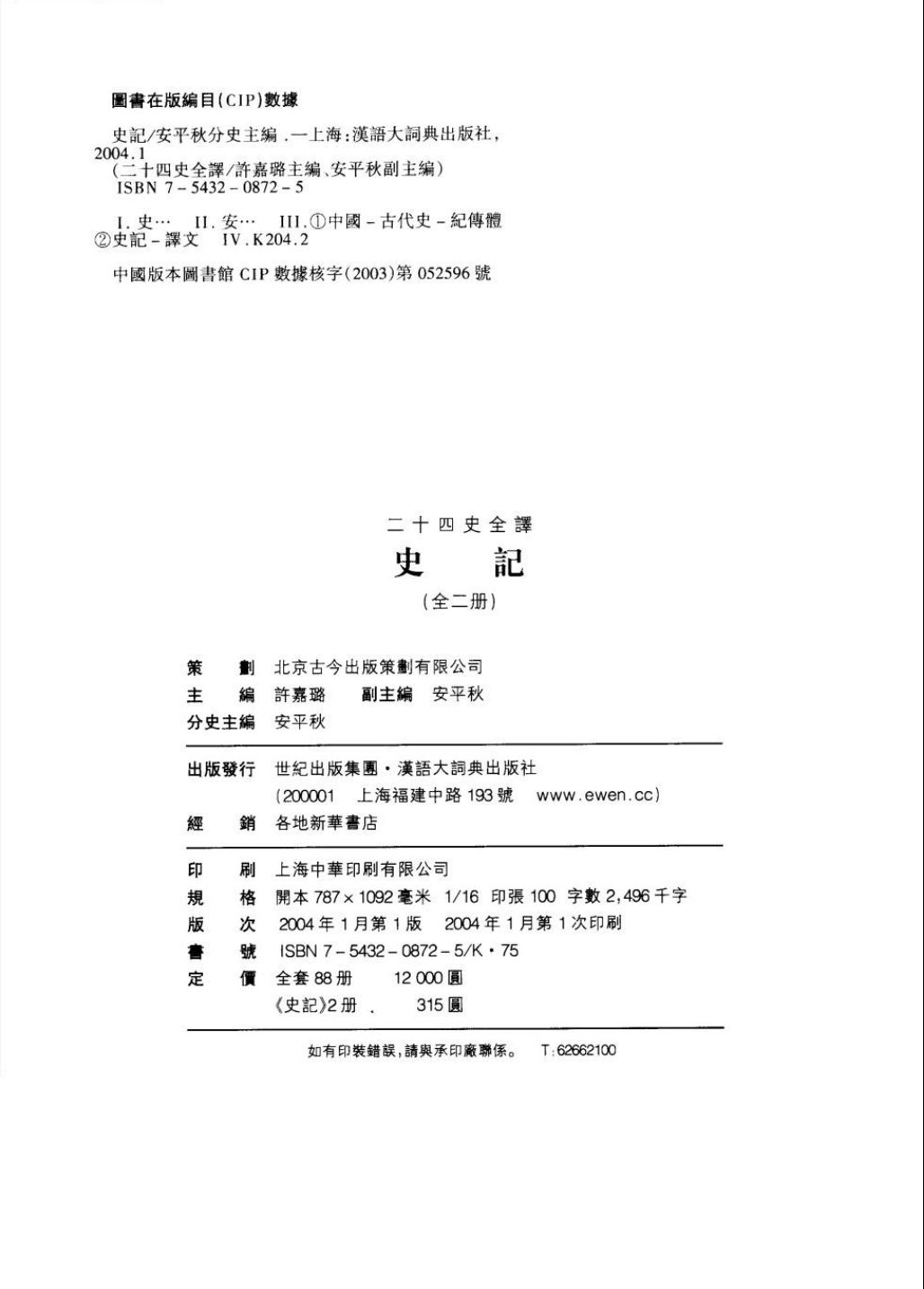 《二十四史全译》,分为88册,计近亿字。在同一书面上,左栏为《二十四史》原文,右栏则为白话译文。这样的“文白对照”,使人既读到了原著,又欣赏到清新流畅的今译。