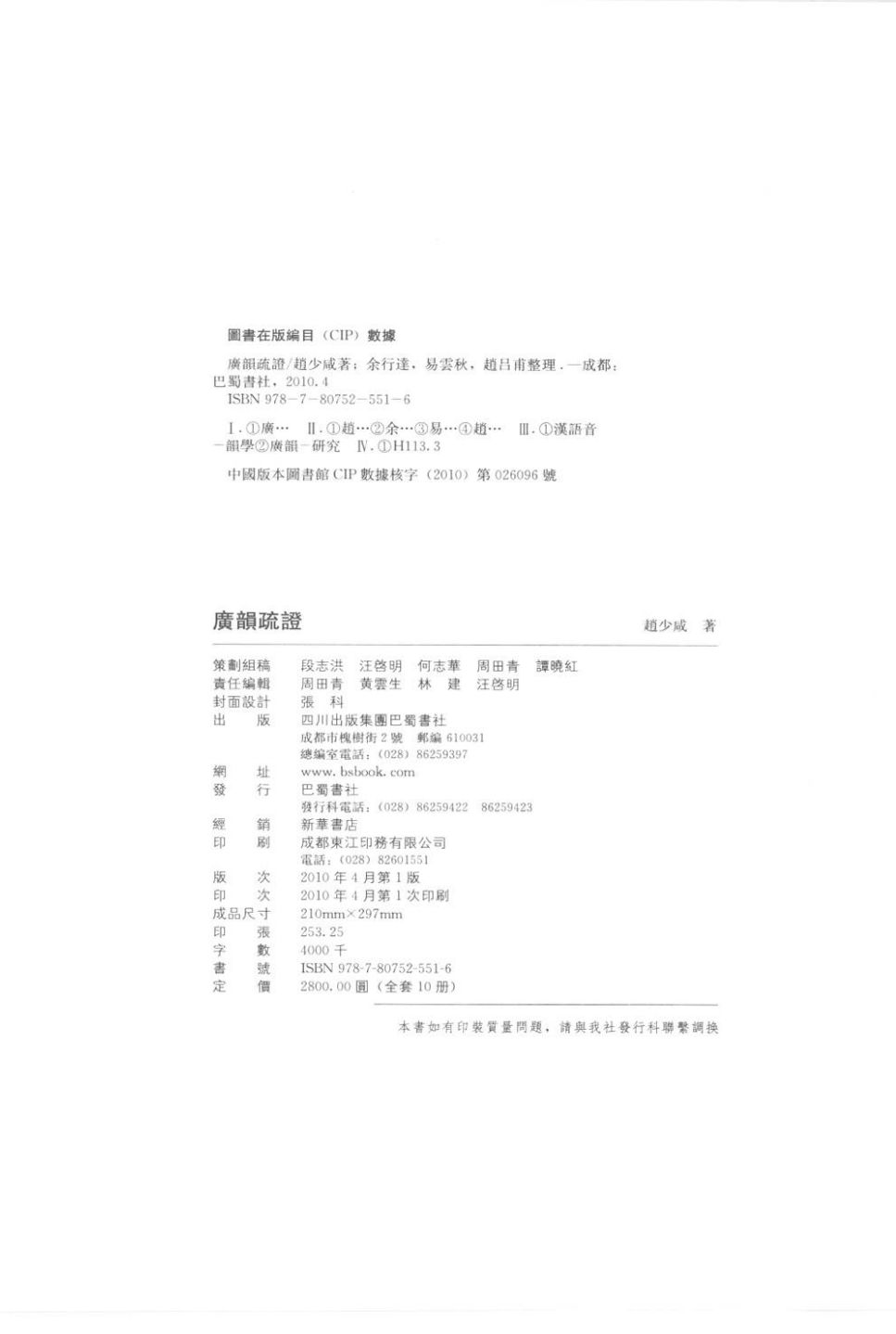 《大宋重修广韵》(简称《广韵》)五卷,是我国北宋时代官修的一部韵书,宋真宗大中祥符元年(1008),由陈彭年、丘雍等奉旨在前代韵书的基础上编修而成,是现今保存最完整、最古老,也是最重要的一步韵书。它完整而详细地记录了中古的(从南北朝到宋末)语言系统,今天的学者还可以依据《广韵》确知中古语音的声母、韵母及声调情况。学者还可以以《广韵》为桥梁,上推古音(两汉以前的语音)、下证今音(现当代语音)。所以说《广韵》是研究汉语语音史、研究当代汉语方言不可缺少的典籍。《广韵疏证》是当今《广韵》研究的集大成之作。它总结性地研究了《广韵》中各韵部之间的纵横关系和内部规律,不仅包含有历代《广韵》研究的主要成果,更有作者赵少咸先生毕生研究心得。全书共分六卷,第一卷上平声,第二卷下平声,第三卷上声,第四卷去声,第五卷入声,第六卷则为引用书目及谐声表,全书共350万字,大16开精装10卷,最近由巴蜀书社出版。本书最大的特点在于集声音、训诂、文献、版本四者于一,互相发明,溯源辨流,旁搜博采,以勘误正疑。程千帆先生曾致书作者之孙、著名语言学家赵振铎先生,以为《广韵疏证》“详校博考,辩以公心,盖自乾、嘉以来三百年中,为斯学既精且专者,(少咸)先生一人而已”。赵少咸(1884-1966),名世宗,以字行。成都人。其学师承乾、嘉戴、段、二王,而自成一家,其文字音韵之学,极为海内学者所推重。《广韵疏证》,为其学术研究之集中代表。曾执教成都高等师范、成都大学、四川大学、国立中央大学,当代著名学者李一氓、徐仁甫、殷孟伦、殷焕先、李孝定、周法高等人,皆出其门下。