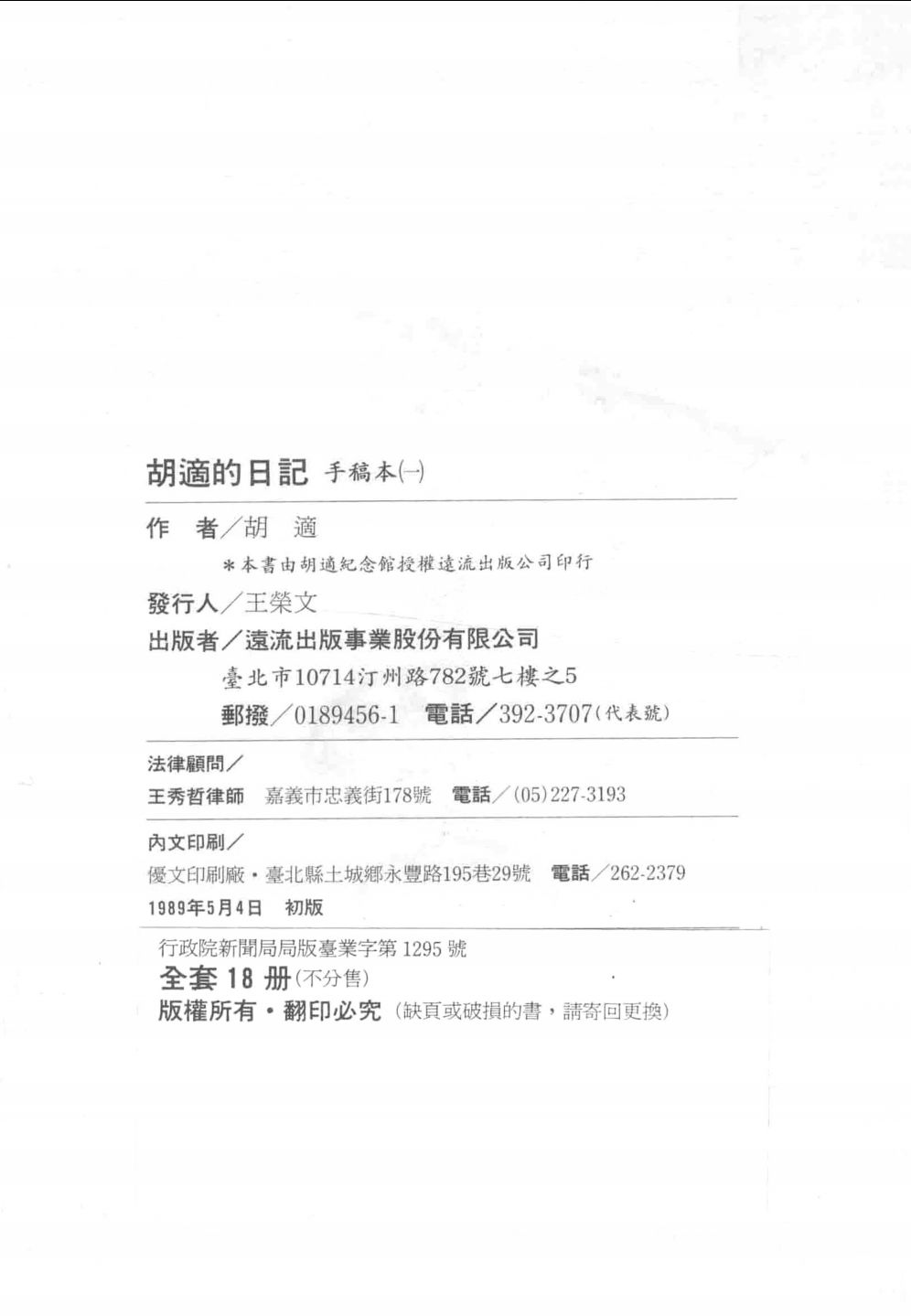 《胡适的日记(手稿本)》(18册),台湾远流出版公司出版,1990。